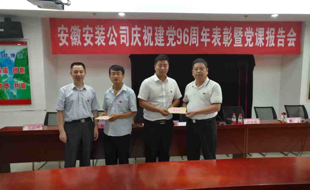 6月29日下午,安徽安裝公司召開(kāi)慶祝建黨96周年表彰大會(huì )暨“七一”專(zhuān)題黨課活動(dòng),公司領(lǐng)導班子、在肥在崗黨員、入黨積極分子以及受表彰的先進(jìn)集體、先進(jìn)個(gè)人等60余人參加了會(huì )議。會(huì )議由公司董事長(cháng)、總經(jīng)理、黨委副書(shū)記王軍邦主持。