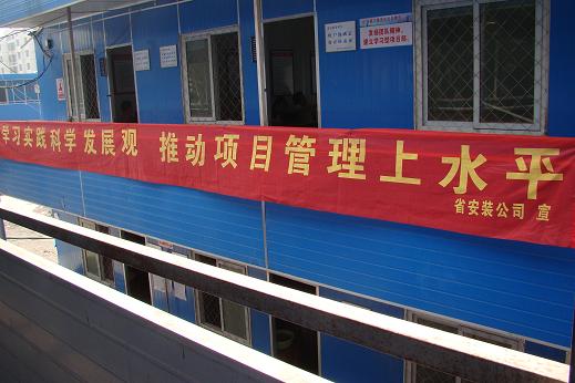 省政務(wù)服務(wù)中心及綜合樓和合肥中心醫院項目屬省、市重點(diǎn)工程之一。由多家大中型施工企業(yè)共同承建。我公司承擔的安裝工作量分別在1582萬(wàn)和2800萬(wàn)以上,是具有相當規模和社會(huì )影響的工程項目。合肥項目黨支部在開(kāi)展第二批實(shí)踐科學(xué)發(fā)展觀(guān)活動(dòng)中,因地制宜地開(kāi)展宣傳活動(dòng)。分別在這兩個(gè)項目施工現場(chǎng)懸掛了《深入開(kāi)展學(xué)習實(shí)踐科學(xué)發(fā)展觀(guān)活動(dòng)》和《學(xué)習實(shí)踐科學(xué)發(fā)展觀(guān)推動(dòng)項目管理上水平》的橫幅標語(yǔ)。目前是整個(gè)施工現場(chǎng)開(kāi)展學(xué)習實(shí)踐科學(xué)發(fā)展觀(guān)活動(dòng)中唯一在現場(chǎng)宣傳的一家施工企業(yè)。