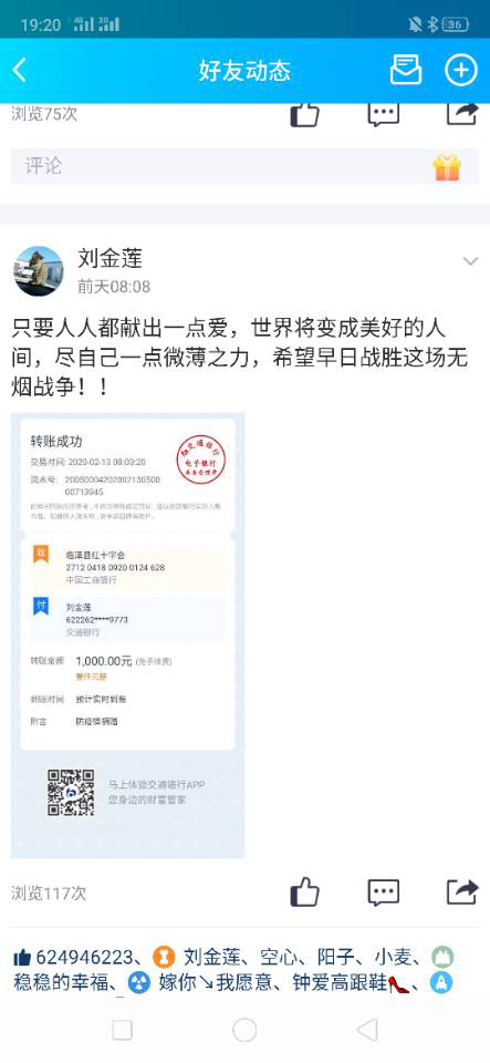 2020213日,劉金蓮同志通過(guò)微信轉賬的方式轉給甘肅省臨澤縣紅十字會(huì )捐款人民幣1000元,然后她又主動(dòng)聯(lián)系當地紅十字會(huì )工作人員要求擔當志愿者,但是因為客觀(guān)原因未被批準。