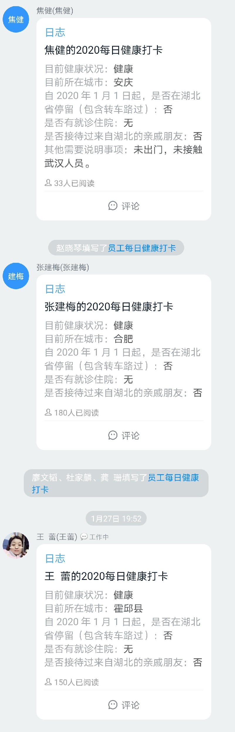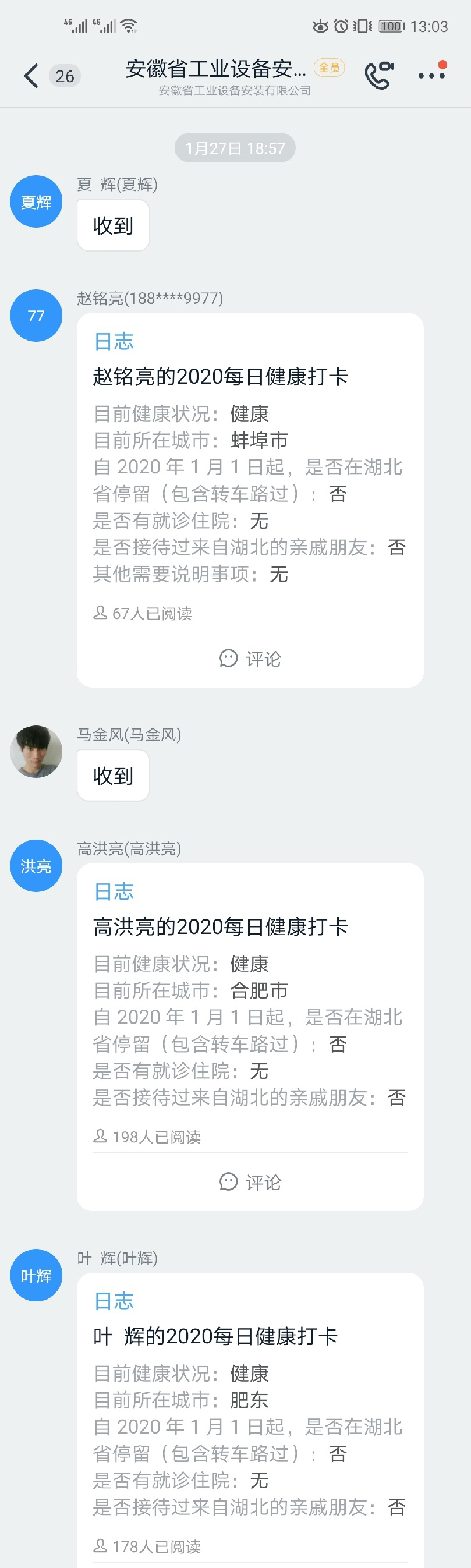 1月27日(大年初三),公司下發(fā)《安徽安裝公司關(guān)于做好新型冠狀病毒肺炎疫情工作的防控措施》,全體員工每日在釘釘日志專(zhuān)項報告當日去向及身體狀況,各分公司、各部門(mén)認真做好登記,確保信息及時(shí)準確,時(shí)刻密切關(guān)注員工的身體健康狀況。