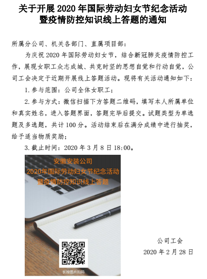 鑒于當前新冠肺炎疫情防控特殊時(shí)期,本著(zhù)不聚集、少聚集的原則,安徽安裝公司工會(huì )組織全公司八十多名女職工參加了疫情防控和《婦女權益保障法》等知識的學(xué)習,利用微信平臺開(kāi)展了線(xiàn)上答題活動(dòng),活動(dòng)一推出,廣大女職工立即響應,熱情高漲,對于不太清楚的問(wèn)題,主動(dòng)查閱相關(guān)資料,與身邊的同事討論,對模棱兩可的問(wèn)題,仔細斟酌精確作答。通過(guò)此次答題活動(dòng),全公司范圍內再一次掀起宣傳疫情防控常識的熱潮,推動(dòng)公司疫情防控工作的開(kāi)展,也進(jìn)一步普及了新時(shí)期下女職工的合法權益。答題活動(dòng)結束后,對優(yōu)秀成績(jì)給予獎勵。