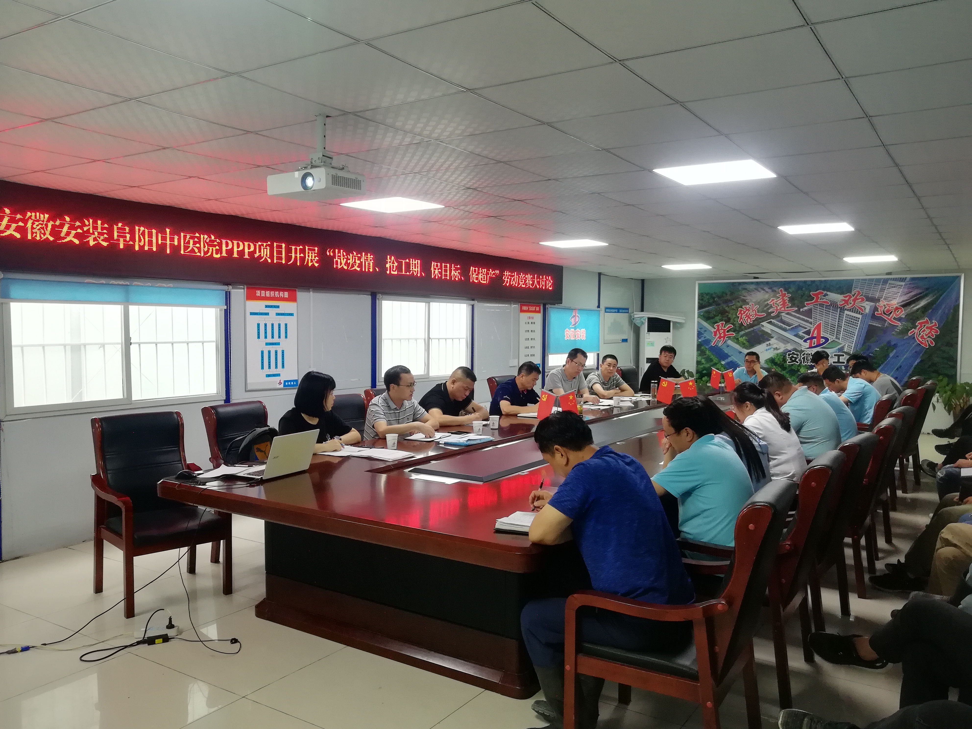 為認真貫徹公司“戰疫情、搶工期、保目標、促超產(chǎn)”勞動(dòng)競賽活動(dòng)精神,7月12日下午,公司紀委書(shū)記、工會(huì )主席李寬旭,副總經(jīng)理王軍一行在阜陽(yáng)潁東中醫院建設PPP項目部會(huì )議室,組織開(kāi)展“戰疫情、搶工期、保目標、促超產(chǎn)”勞動(dòng)競賽大討論,分公司領(lǐng)導班子成員、項目部全體人員30余人參加了會(huì )議,會(huì )議由李寬旭主持。