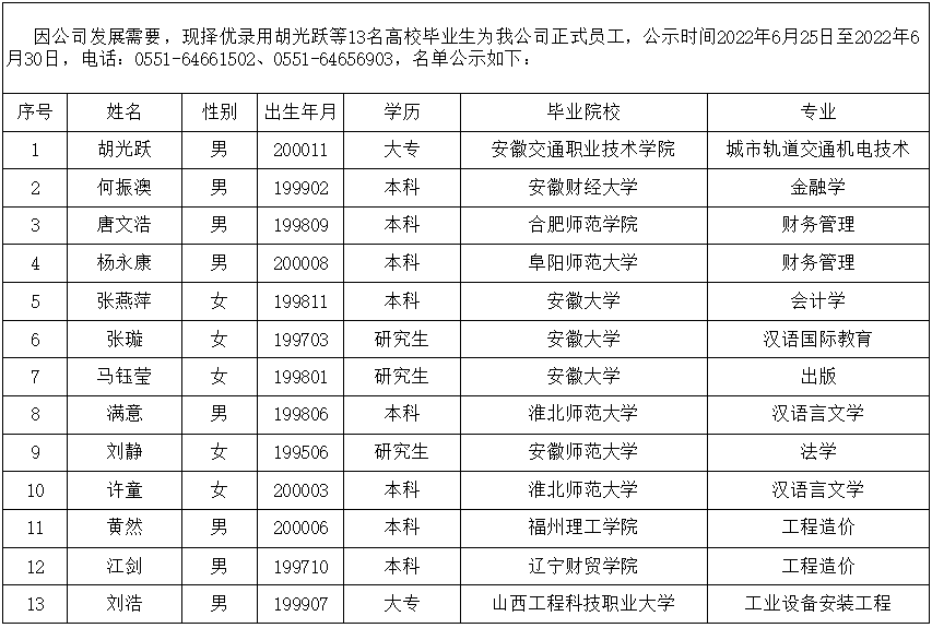 2022高校畢業(yè)生公示(13人)