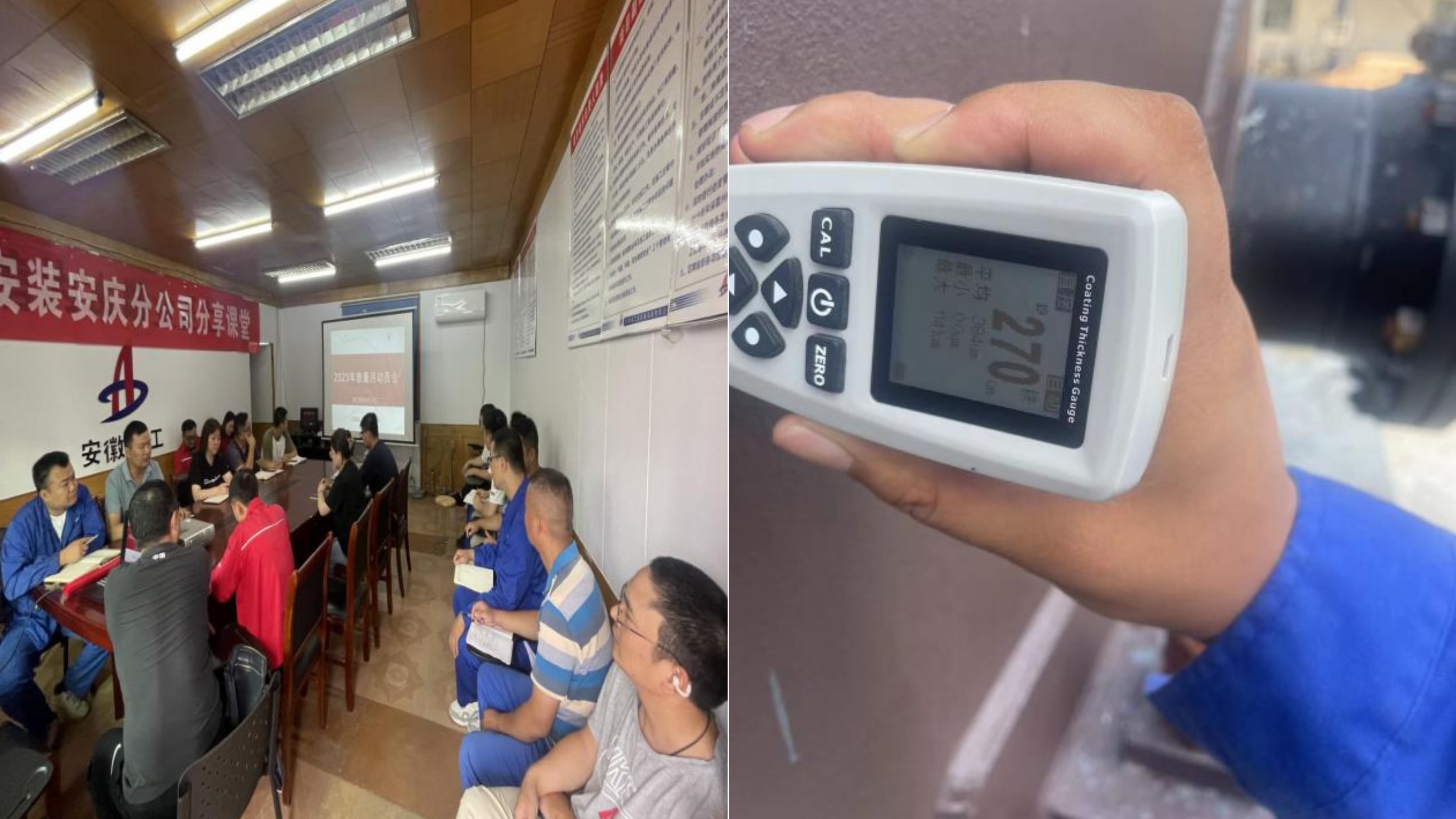 安慶分公司組織機關(guān)及所屬項目舉行“質(zhì)量月”動(dòng)員會(huì ),安慶石化循環(huán)水項目開(kāi)展儲罐防腐保溫專(zhuān)項檢查(檢查中間漆涂層厚度)
