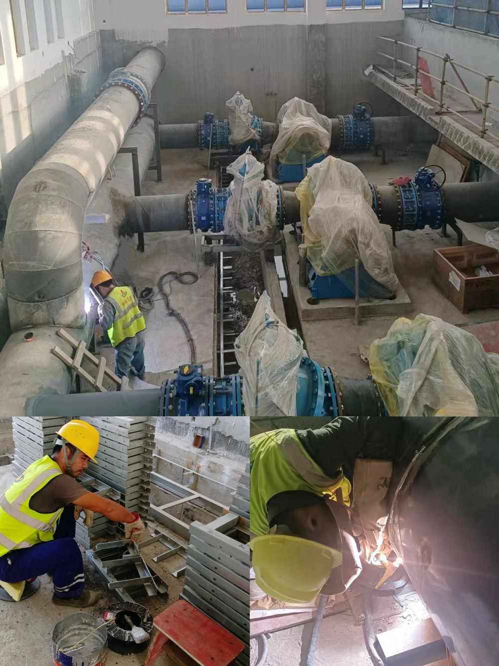 圖為合肥七水廠(chǎng)三期電安裝項目電纜溝支架刷漆、碳濾池管廊水沖管焊接