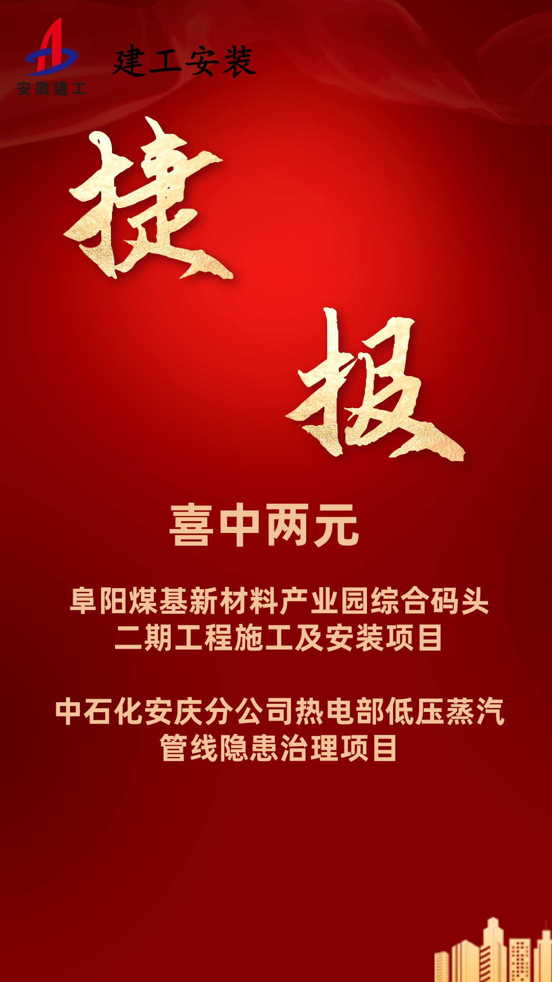 近期,建工安裝喜中兩元,成功中標阜陽(yáng)煤基新材料產(chǎn)業(yè)園綜合碼頭二期工程施工及安裝項目以及中石化安慶分公司熱電部低壓蒸汽管線(xiàn)隱患治理項目,中標總金額5400萬(wàn)元。