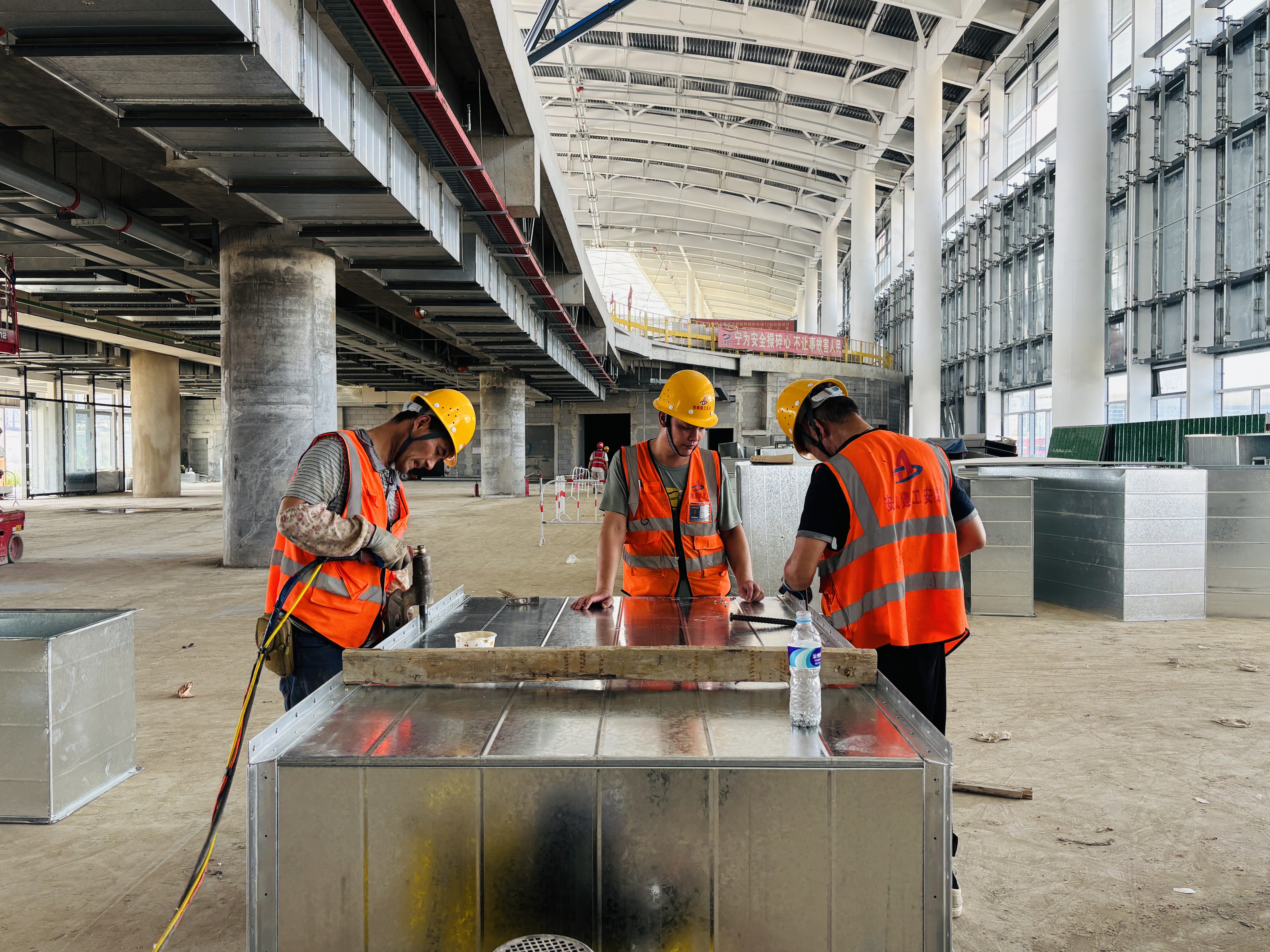 急難險重之處,黨旗始終高揚。項目部成立“機電攻堅黨員突擊隊”,黨員帶頭負責最復雜區域的安裝任務(wù);青年技術(shù)骨干組成“創(chuàng )新攻關(guān)小組”,成功優(yōu)化超高大空間風(fēng)管提升方案,效率提升30%;面對持續高溫天氣,后勤保障組推出一系列防暑降溫舉措,科學(xué)調整作息、物資保障到位、改善作業(yè)環(huán)境、健康關(guān)懷升級,為一線(xiàn)建設者撐起“清涼傘”。